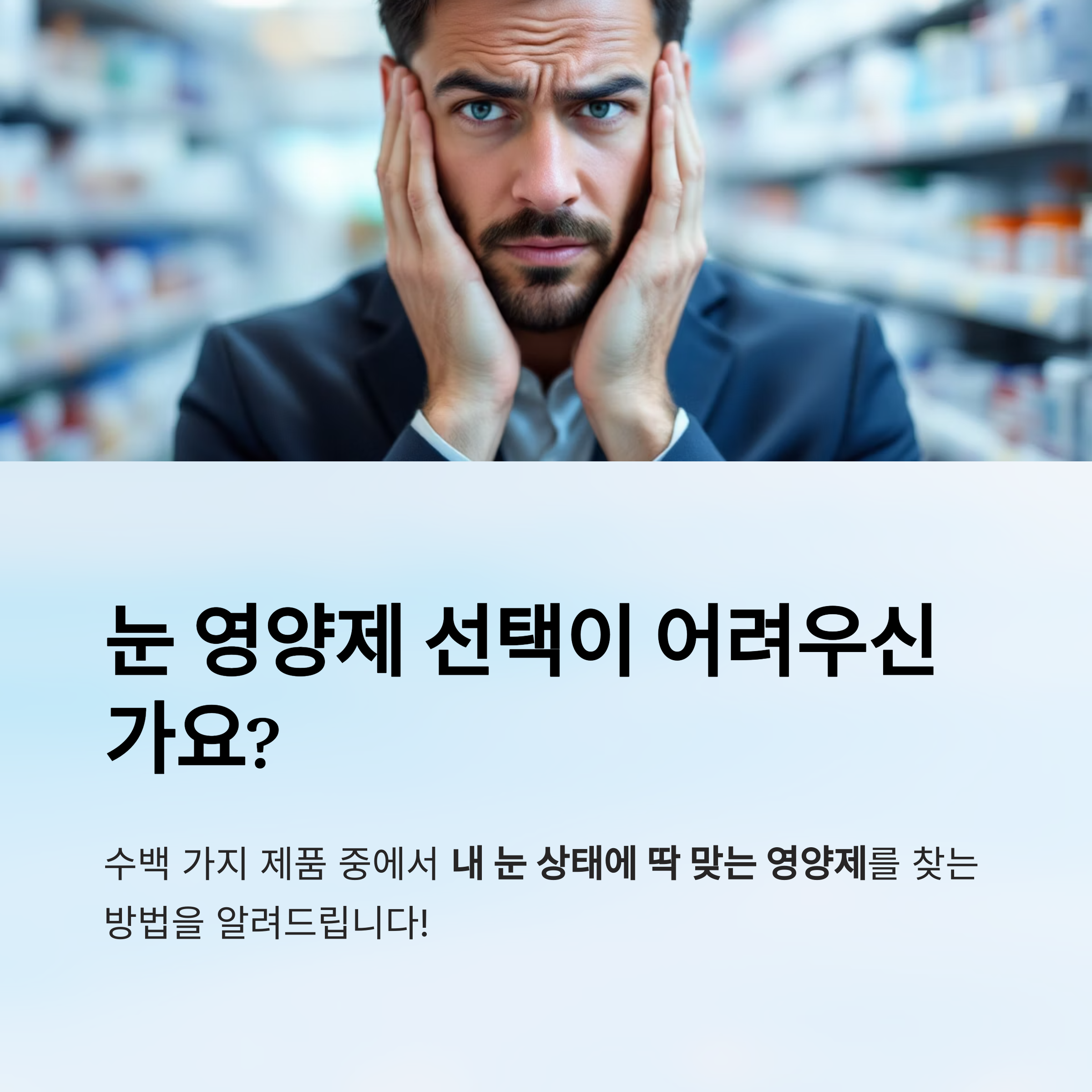 눈 영양제, 너무 많아서 헷갈린다면? 나에게 맞는 제품 고르는 법!📌 글 목차1. 눈 영양제가 필요한 이유2. 눈 상태별 주요 성분 정리3. 나에게 맞는 성분은?4. 눈 영양제 고르는 팁5. 복용 시 주의사항약국이나 온라인몰에서 '눈에 좋은 영양제'를 검색하면 수십, 수백 가지 제품이 나옵니다. 루테인, 지아잔틴, 오메가3, 비타민A, 콘드로이틴… 도대체 뭐가 나한테 맞는 걸까요? 내 눈 상태에 딱 맞는 영양제를 고르고 싶지만, 정보는 넘치고 비교는 어려워 고민되신 적 있나요? 지금부터 눈 건강에 필요한 영양 성분과, 증상별 추천 가이드를 명확히 정리해 드립니다.😣 눈 영양제가 필요한 이유현대인의 눈은 혹사당하고 있습니다. 하루 종일 컴퓨터 화면, 스마트폰, 인공조명에 노출된 채로 생활하다 보면, 눈..