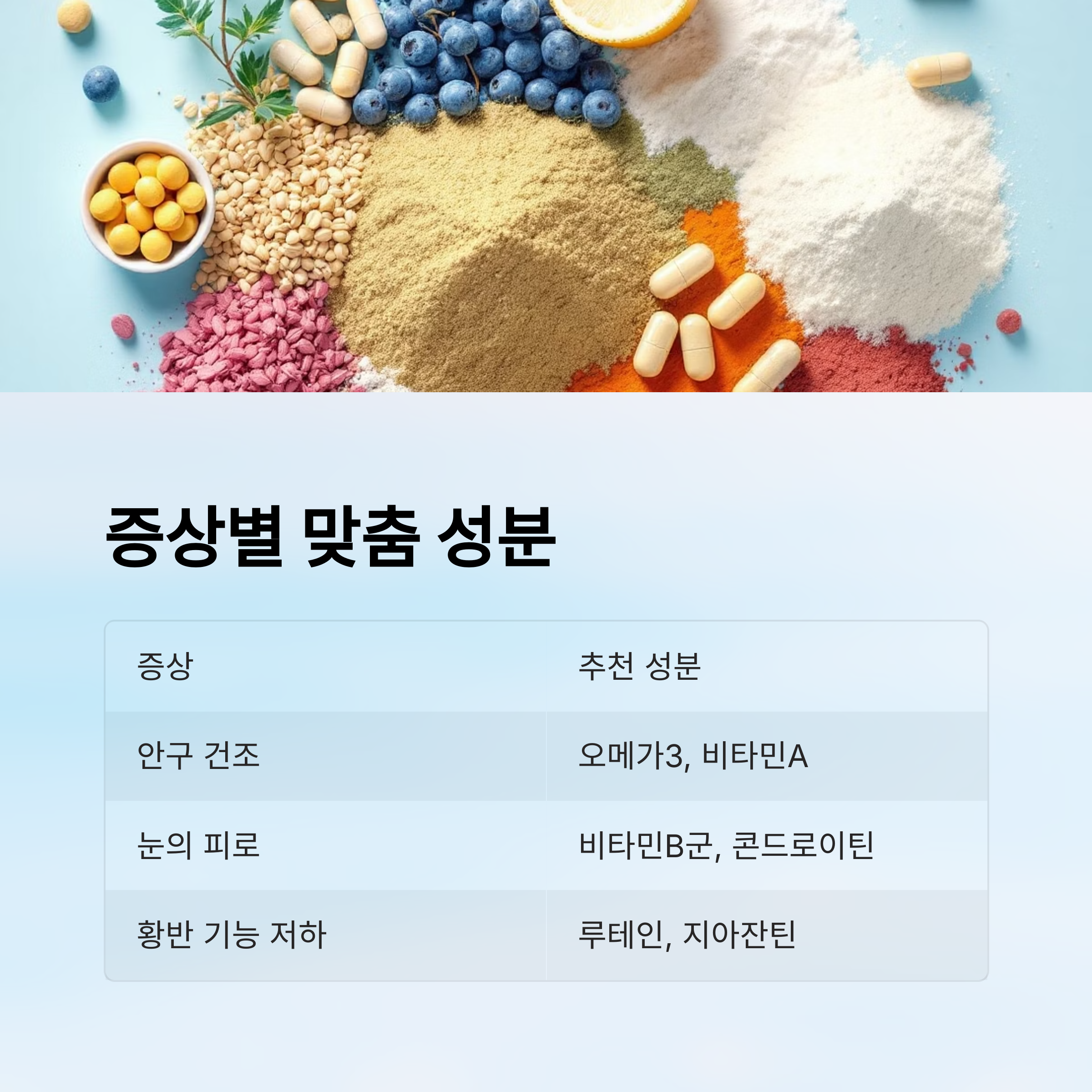 눈 영양제를 고를 때는 단순히 유명 제품을 따라가기보다 자신의 눈 상태와 증상에 맞춘 성분을 선택하는 것이 중요합니다. 안구 건조에는 오메가3, 황반 보호에는 루테인과 지아잔틴, 눈 피로에는 비타민B군이 효과적입니다.