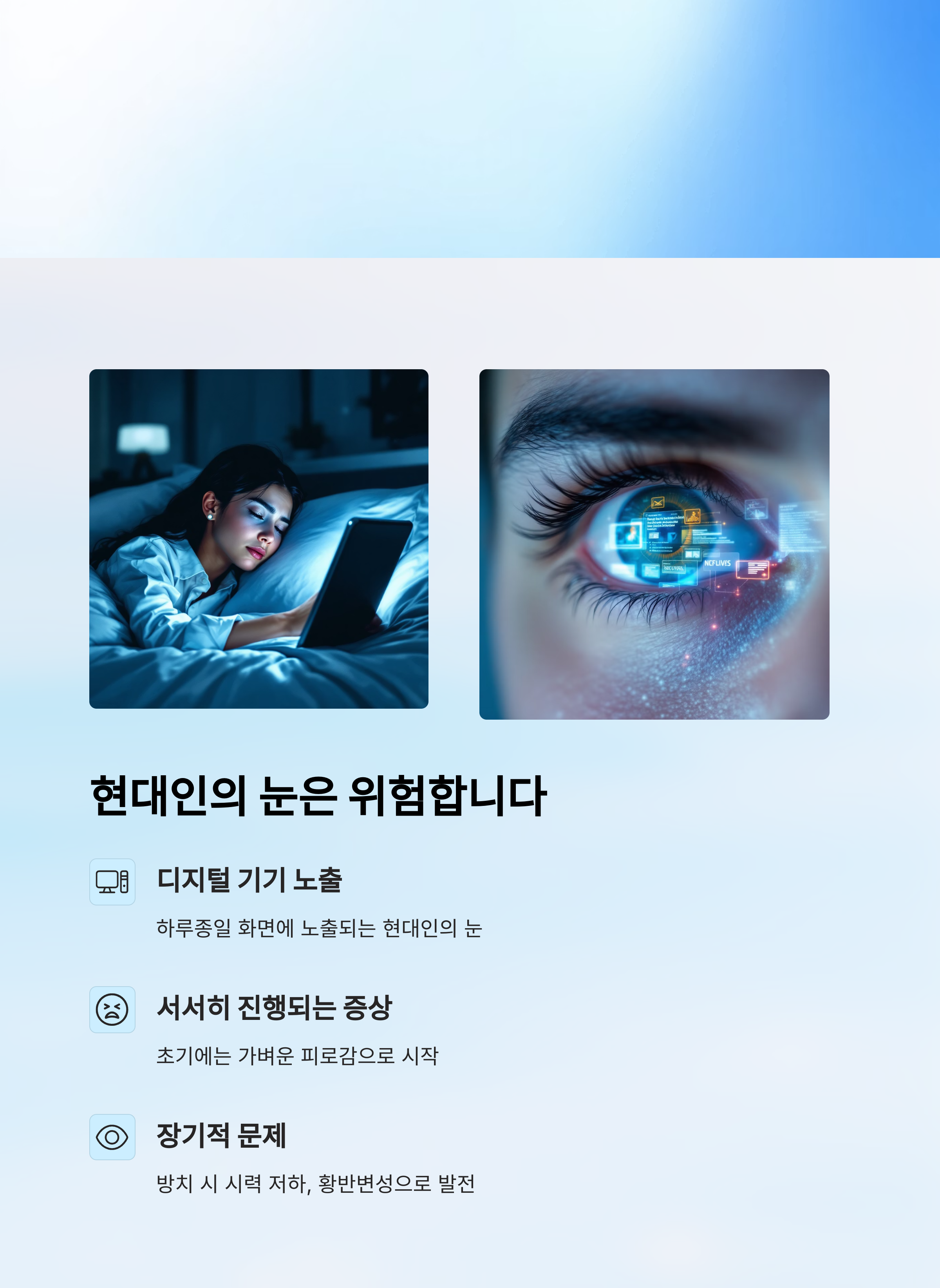 현대인의 눈은 혹사당하고 있습니다. 하루 종일 컴퓨터 화면, 스마트폰, 인공조명에 노출된 채로 생활하다 보면, 눈은 쉽게 피로해지고 건조해지며, 장기적으로는 시력 저하나 황반변성 같은 문제로 이어질 수 있습니다.