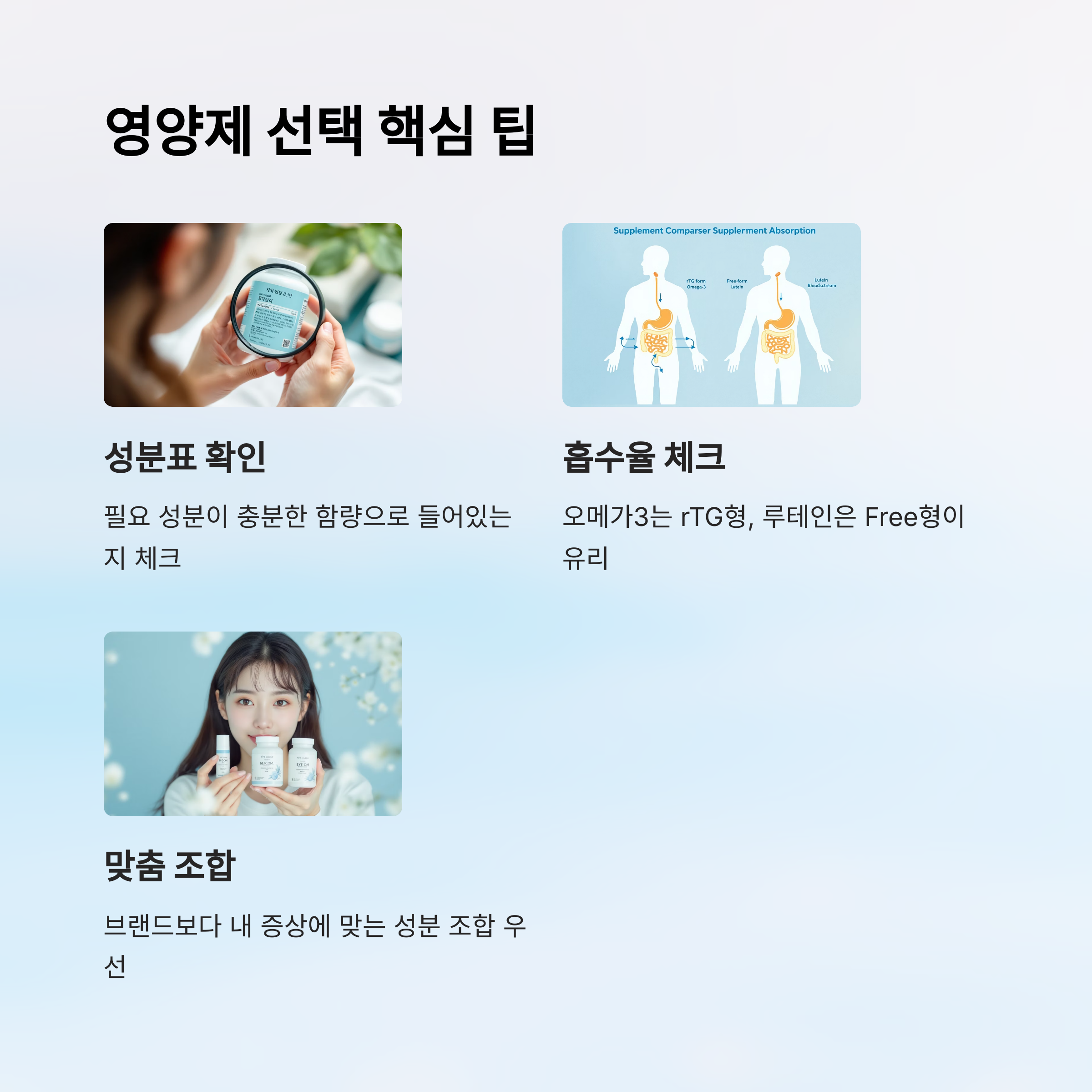 눈 영양제를 고를 때는 단순히 유명 제품을 따라가기보다 자신의 눈 상태와 증상에 맞춘 성분을 선택하는 것이 중요합니다. 안구 건조에는 오메가3, 황반 보호에는 루테인과 지아잔틴, 눈 피로에는 비타민B군이 효과적입니다.
