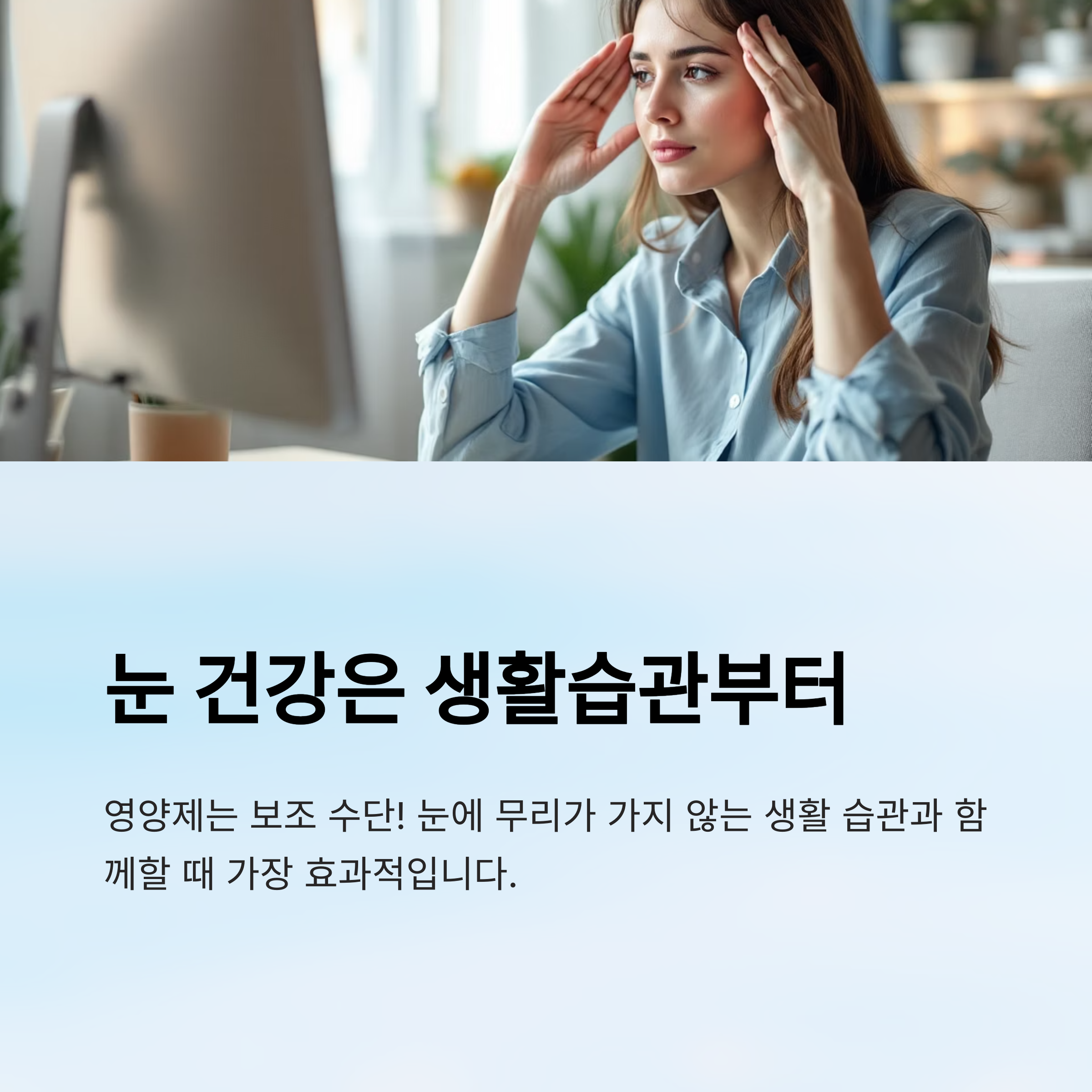 제품 선택 시 성분 함량, 제형, 흡수율을 확인하고, 특히 지용성 성분은 과다 복용을 피해야 합니다. 영양제는 어디까지나 보조 수단이므로 눈에 무리가 가지 않는 생활 습관과 함께 활용할 때 가장 효과적입니다.