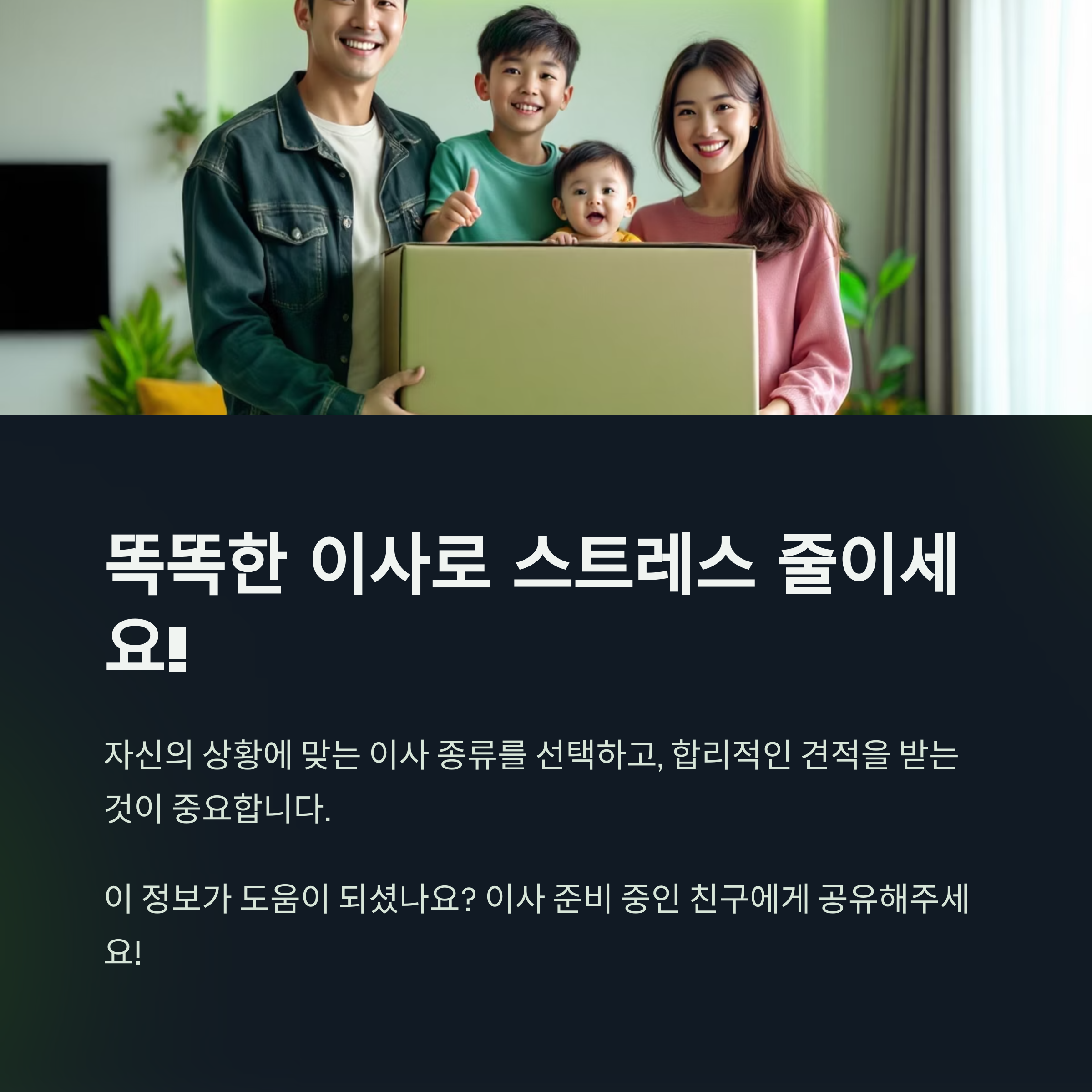 자신의 상황에 맞는 이사 종류를 선택하고, 합리적인 견적을 받는 것이 이사 스트레스를 줄이는 첫걸음입니다.