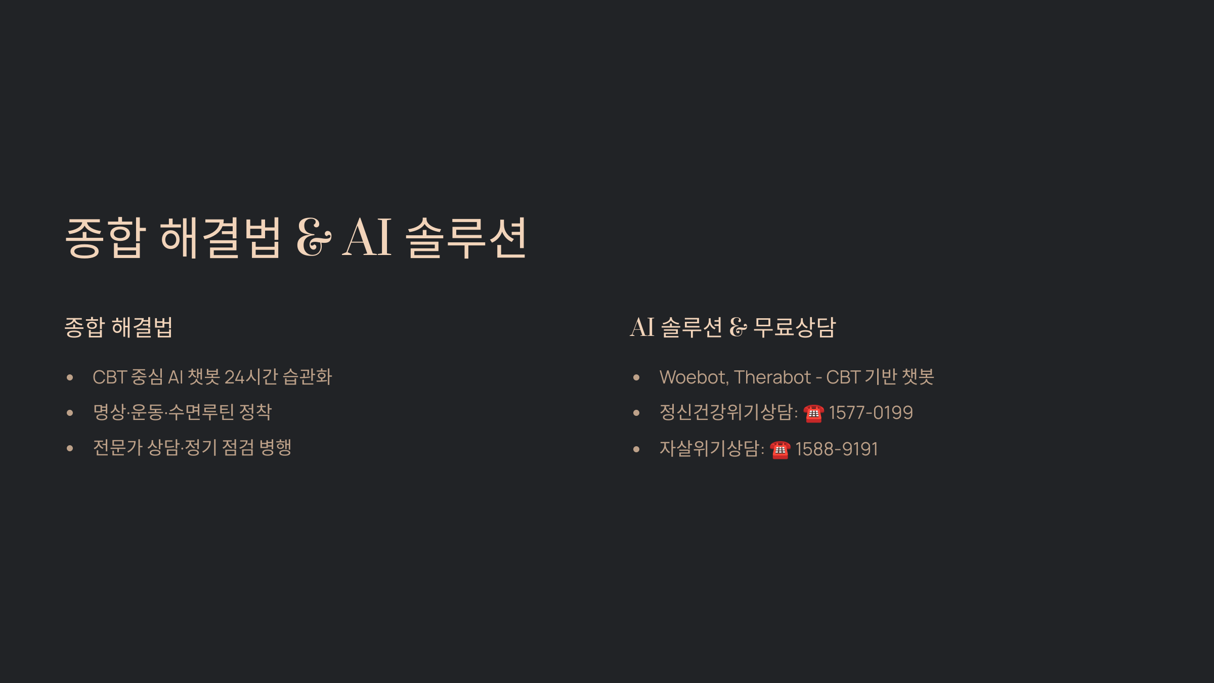 AI 기반 솔루션, 자가진단, 무료상담 링크까지 연결하여 실질적인 도움이 될 수 있도록 구성했습니다.
