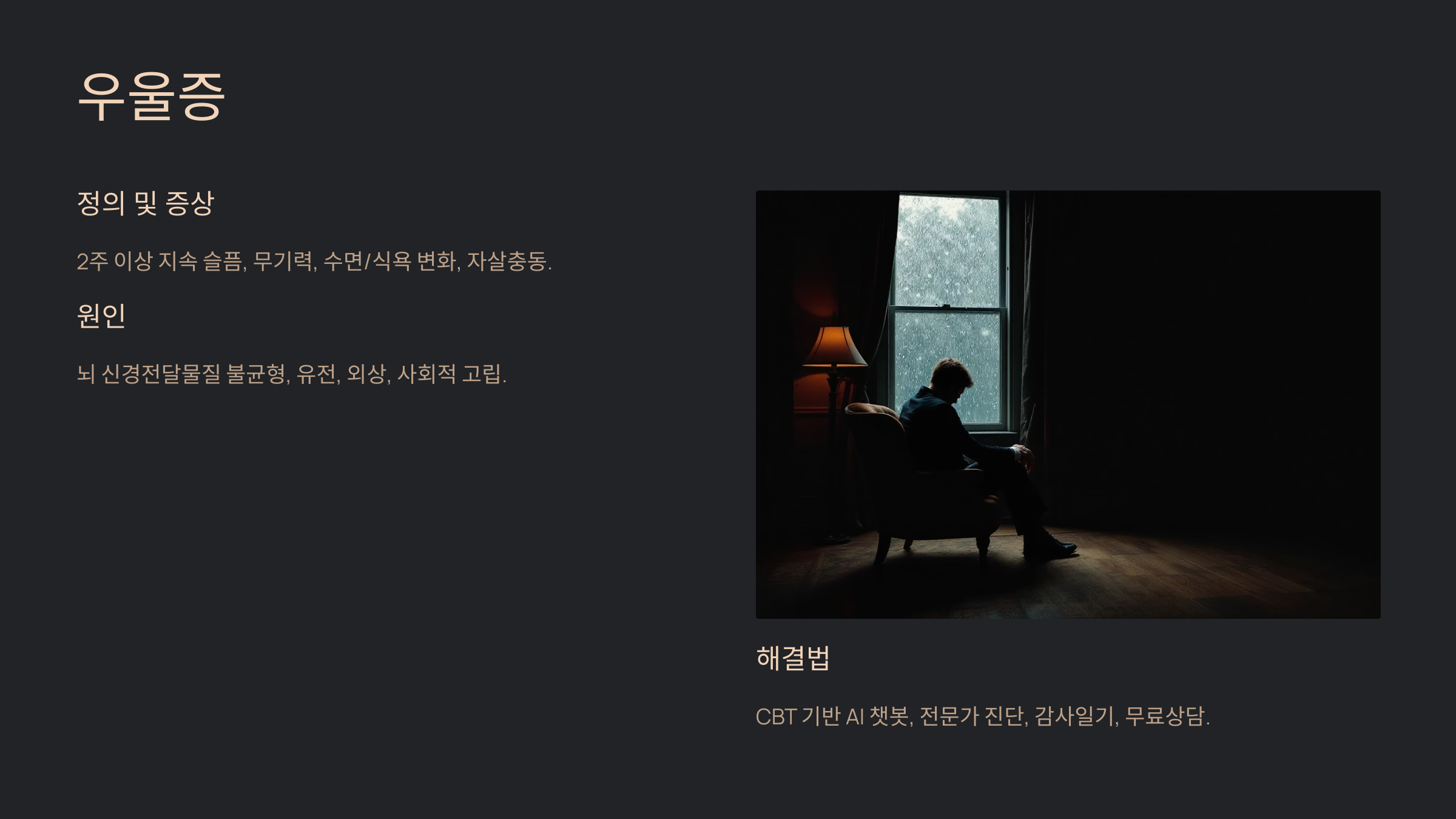 • CBT 기반 AI 챗봇으로 부정적 사고 패턴 점검