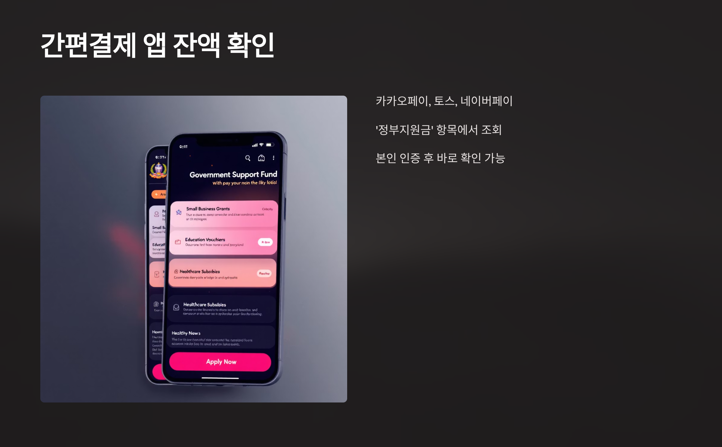 카카오페이, 토스, 네이버페이 등 간편결제 앱의 ‘정부지원금’ 항목에서 잔액 및 사용내역을 조회할 수 있습니다. 본인 인증만 하면 바로 확인 가능하여 간편합니다.