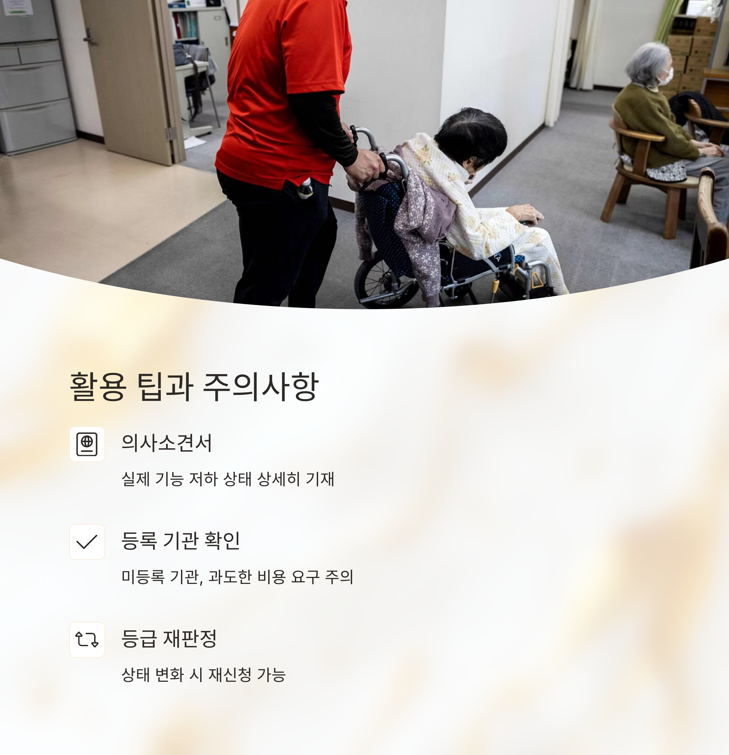 또한 공단에 등록되지 않은 기관이나 과도한 비용을 요구하는 업체는 주의해야 합니다. 서비스 이용 후에는 영수증과 비용 내역을 꼼꼼히 확인하고, 이상이 있을 경우 즉시 공단에 문의하는 것이 좋습니다. 상황 변화가 있다면 등급 재판정도 가능하므로, 주기적으로 상태를 점검하는 것도 중요합니다.