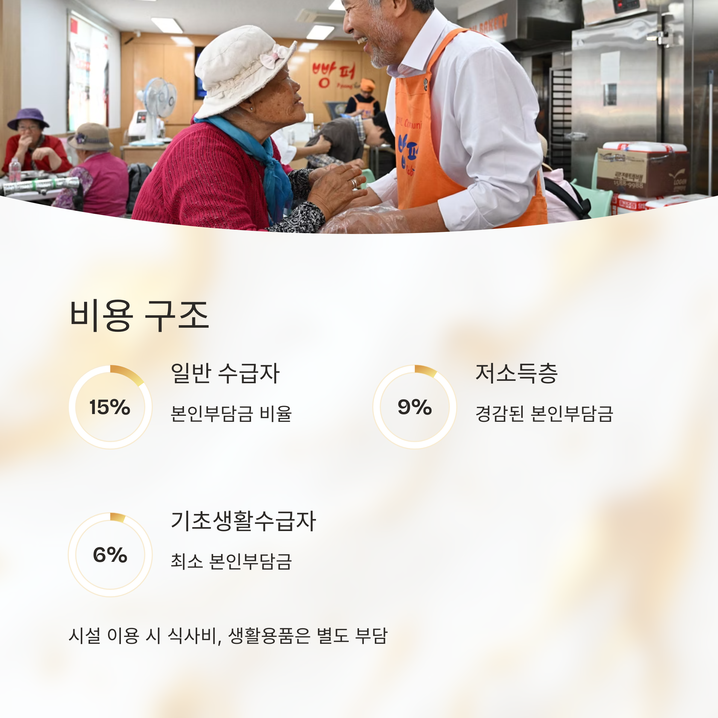 예를 들어, 월 100만 원 상당의 서비스를 이용할 경우 일반 수급자는 약 15만 원을 부담하게 됩니다. 다만, 시설 서비스 이용 시 식사비, 간식비, 생활용품 등은 별도로 본인이 전액 부담해야 하므로, 요양원 선택 시 이 부분을 꼼꼼히 확인하는 것이 좋습니다.