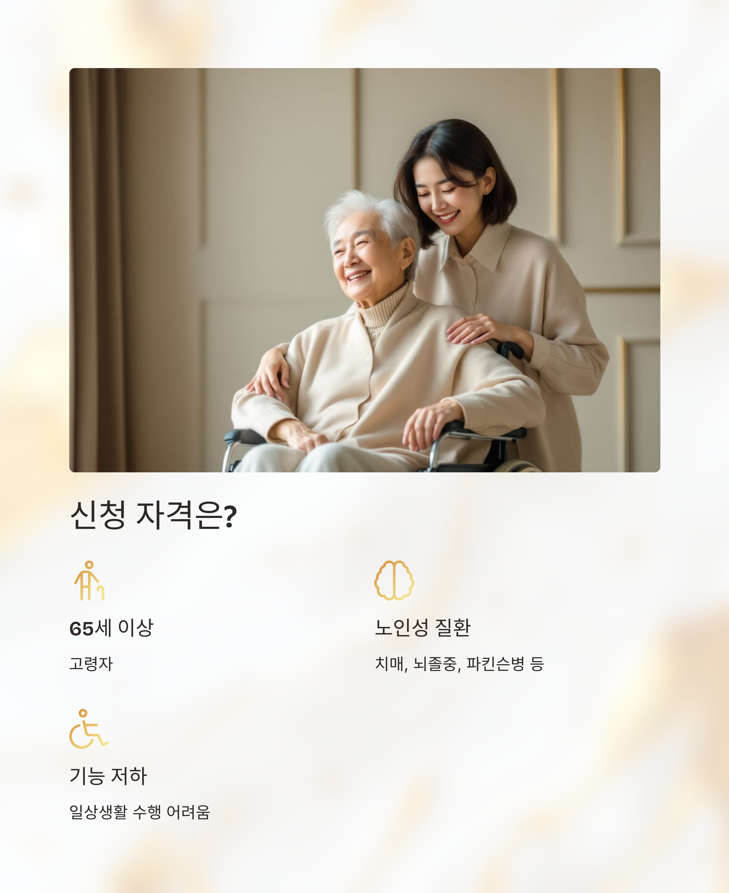노인장기요양보험은 기본적으로 만 65세 이상의 고령자를 대상으로 합니다. 다만, 65세 미만이라도 치매, 뇌졸중, 파킨슨병 등 노인성 질환으로 인해 일상생활 수행이 어려운 경우에도 신청이 가능합니다.