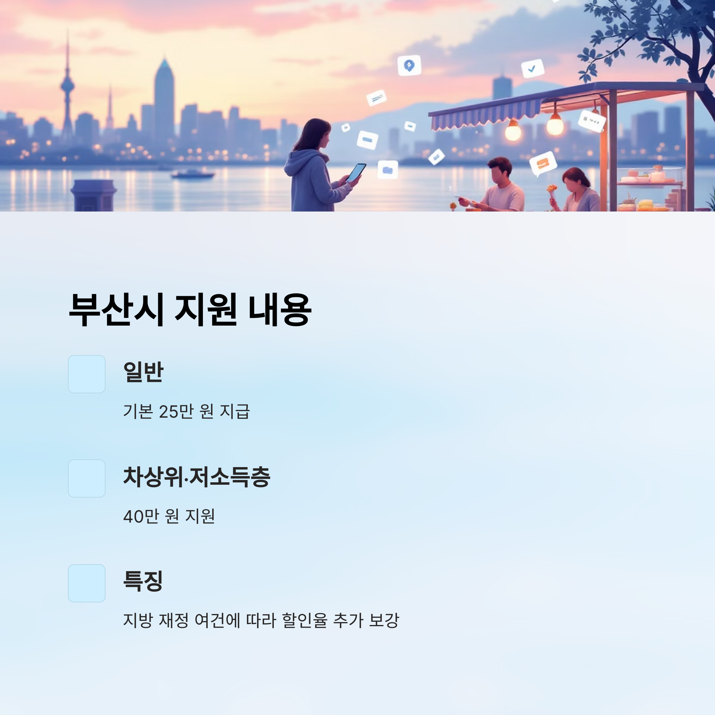- 소득별 차등지급: 일반 25만 원 · 취약계층 40~50만 원