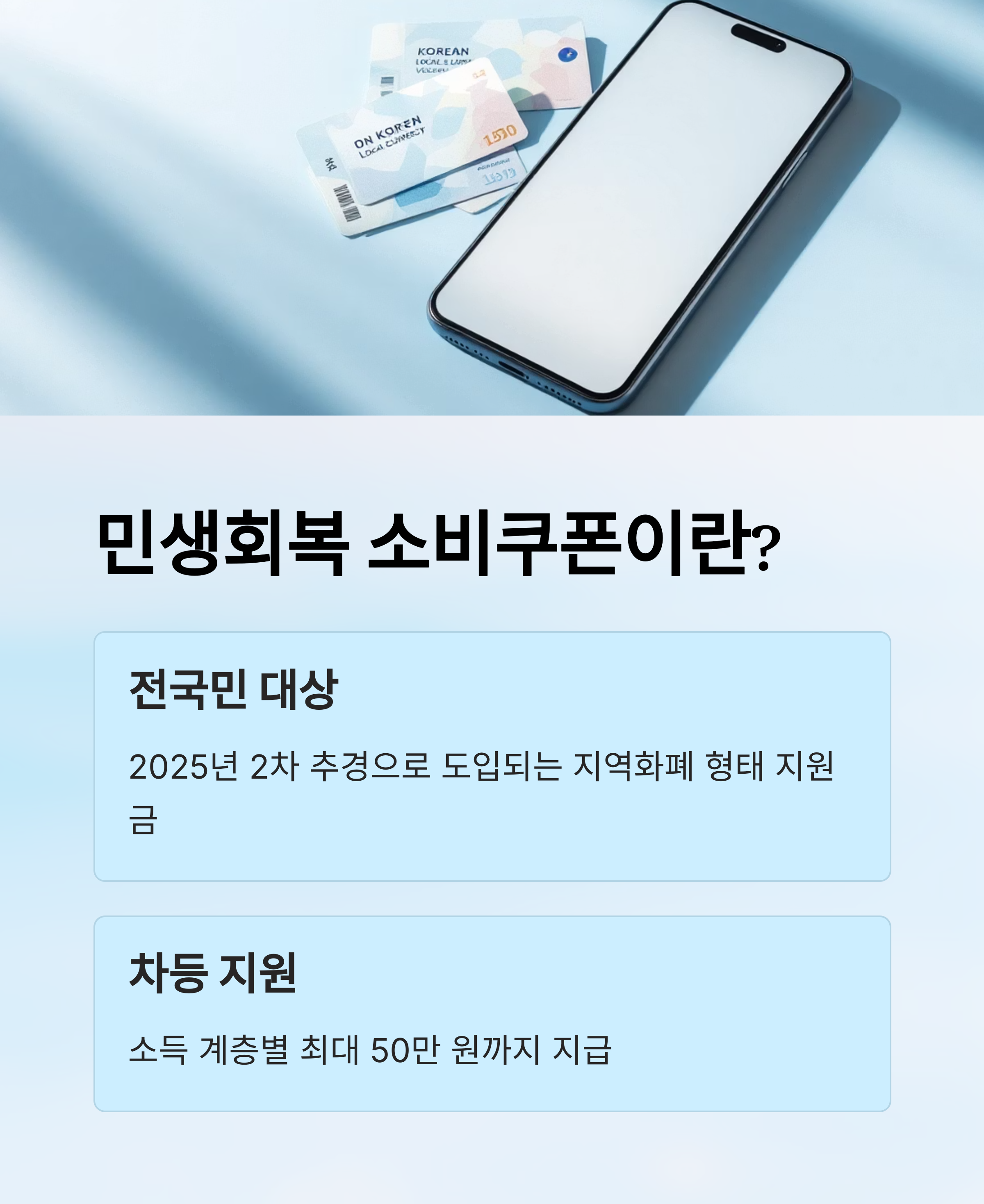 2025년 2차 추경으로 도입되는 민생회복 소비쿠폰은 전국민에게 지역화폐(지역사랑상품권) 형태로 지급되며, 소득 계층별로 최대 50만 원까지 차등 지원됩니다.
