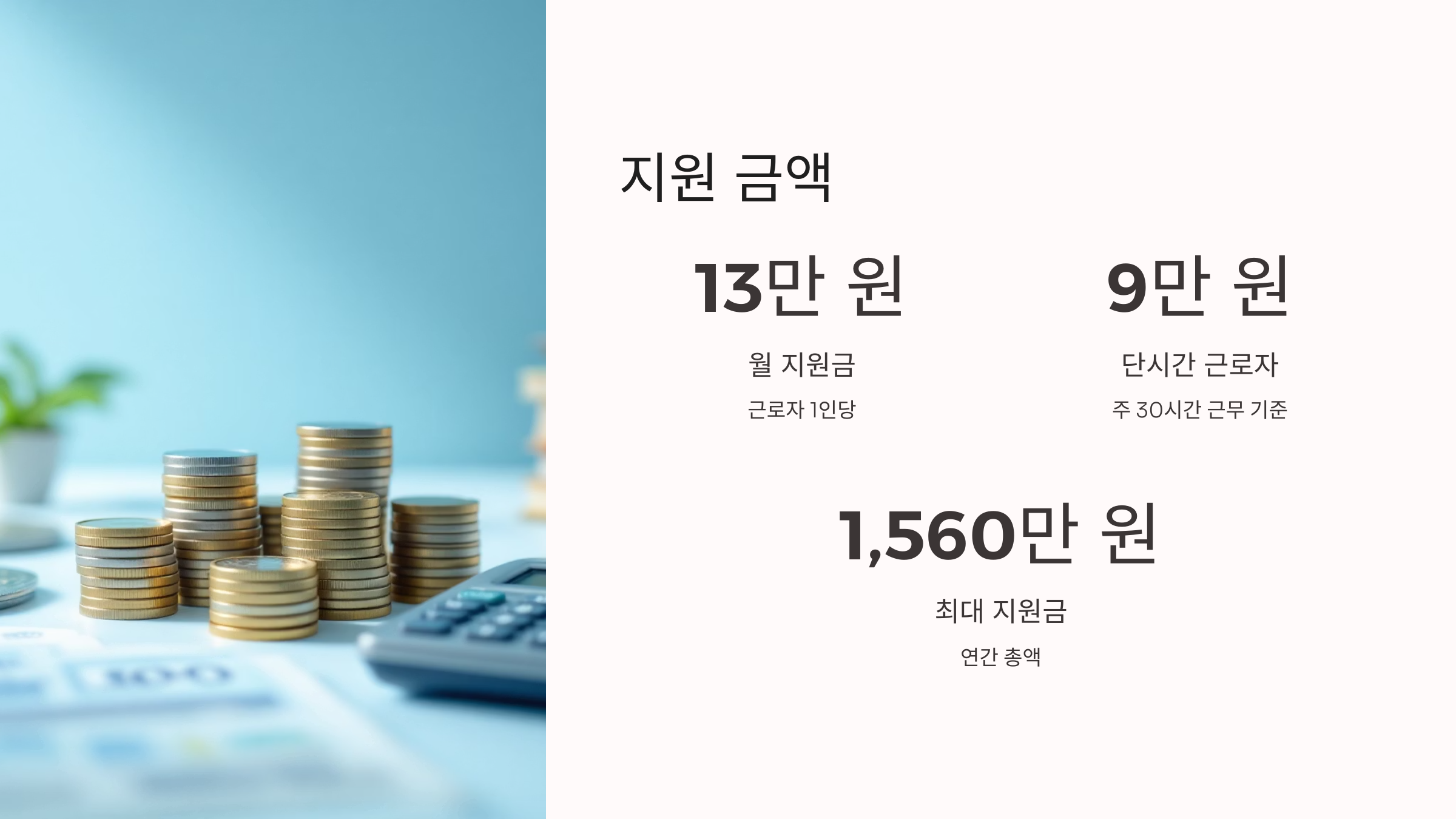 근로자 1인당 월 13만 원을 지원받을 수 있습니다. 단시간 근로자의 경우 근로시간에 비례하여 지원금이 조정됩니다. 예를 들어, 주 30시간 근로자는 월 9만 원의 지원을 받을 수 있습니다.