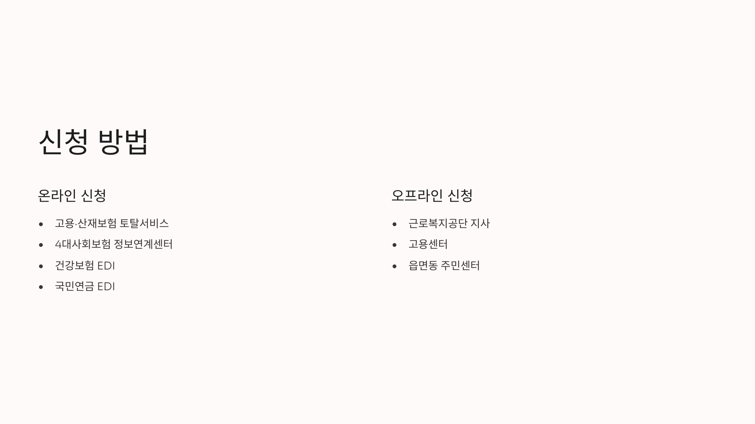 신청은 온라인과 오프라인 모두 가능합니다. 온라인은 고용·산재보험 토탈서비스, 4대사회보험 정보연계센터, 건강보험 EDI, 국민연금 EDI를 통해 신청할 수 있습니다. 오프라인은 근로복지공단 지사, 고용센터, 읍면동 주민센터를 방문하여 신청할 수 있습니다.