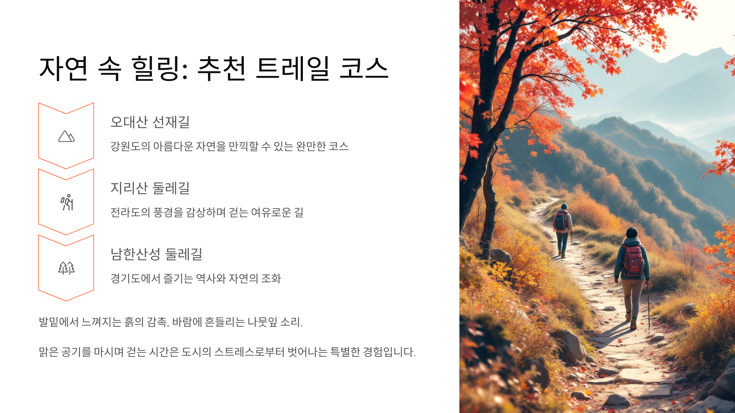 자연 속에서의 트레킹은 그 자체로 힐링이 됩니다. 발밑에서 느껴지는 흙의 감촉, 바람에 흔들리는 나뭇잎 소리, 그리고 맑은 공기를 마시며 걷는 그 시간은 도시의 소음과 스트레스로부터 잠시나마 벗어날 수 있는 특별한 경험이죠. 대표적인 추천 코스로는 강원도의 '오대산 선재길', 전라도의 '지리산 둘레길', 그리고 경기도의 '남한산성 둘레길'이 있습니다. 각 코스는 자연 그대로의 아름다움을 간직하고 있으며, 중년의 여유로움을 만끽할 수 있는 완만한 길로 구성되어 있습니다. 걷는 동안 잠시 발걸음을 멈추고 주위를 둘러보세요. 피어나는 야생화와 졸졸 흐르는 작은 계곡이 반겨줄 겁니다.