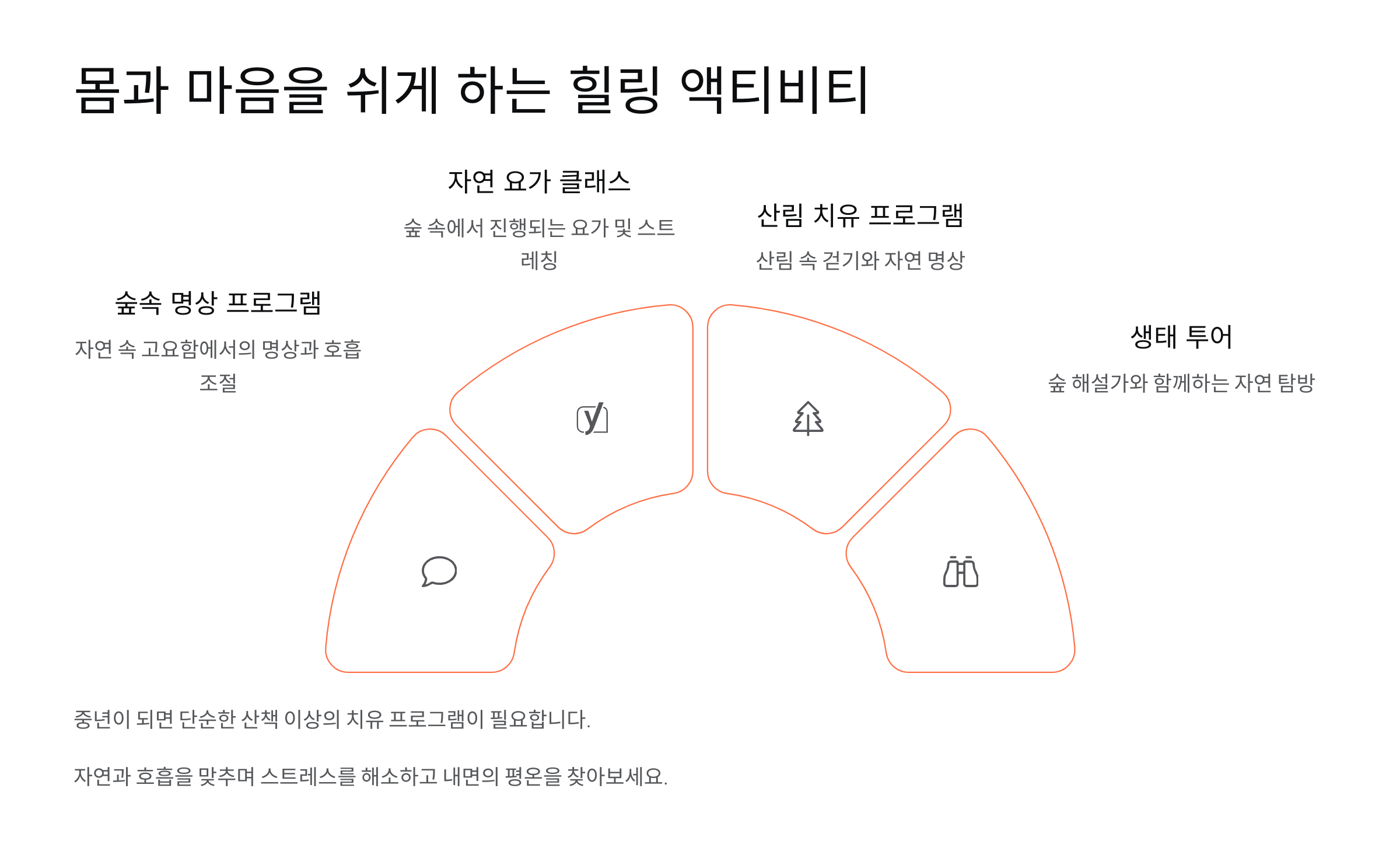 자연 속에서 단순히 걷는 것만으로도 충분한 힐링이 되지만, 그 외에도 다양한 액티비티가 있습니다. 특히, 중년이 되면 단순한 산책 이상의 치유 프로그램이 필요할 때가 많습니다. 여기 몇 가지 추천 드릴게요.