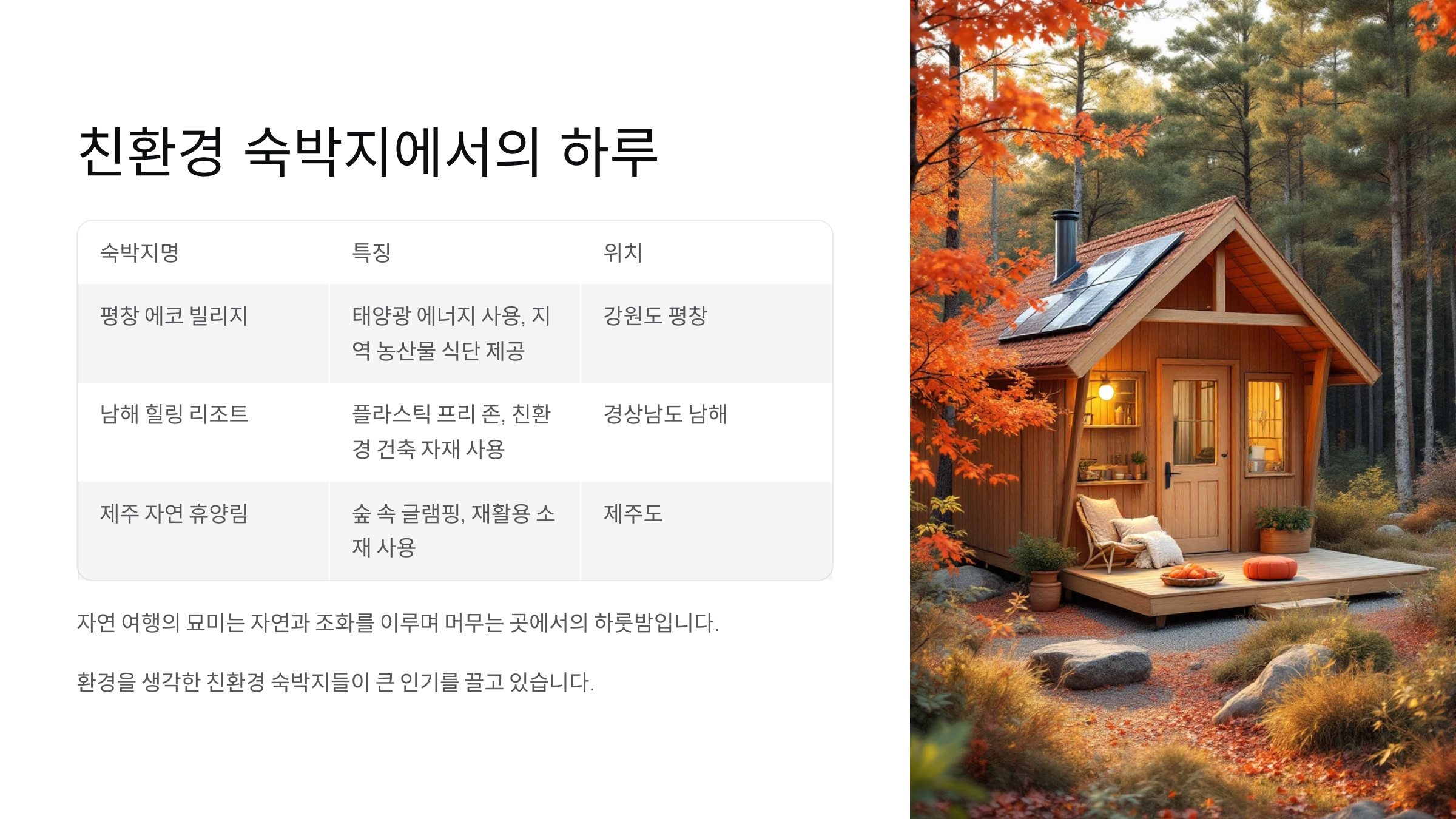 | 평창 에코 빌리지 | 태양광 에너지 사용, 지역 농산물 식단 제공 | 강원도 평창 |