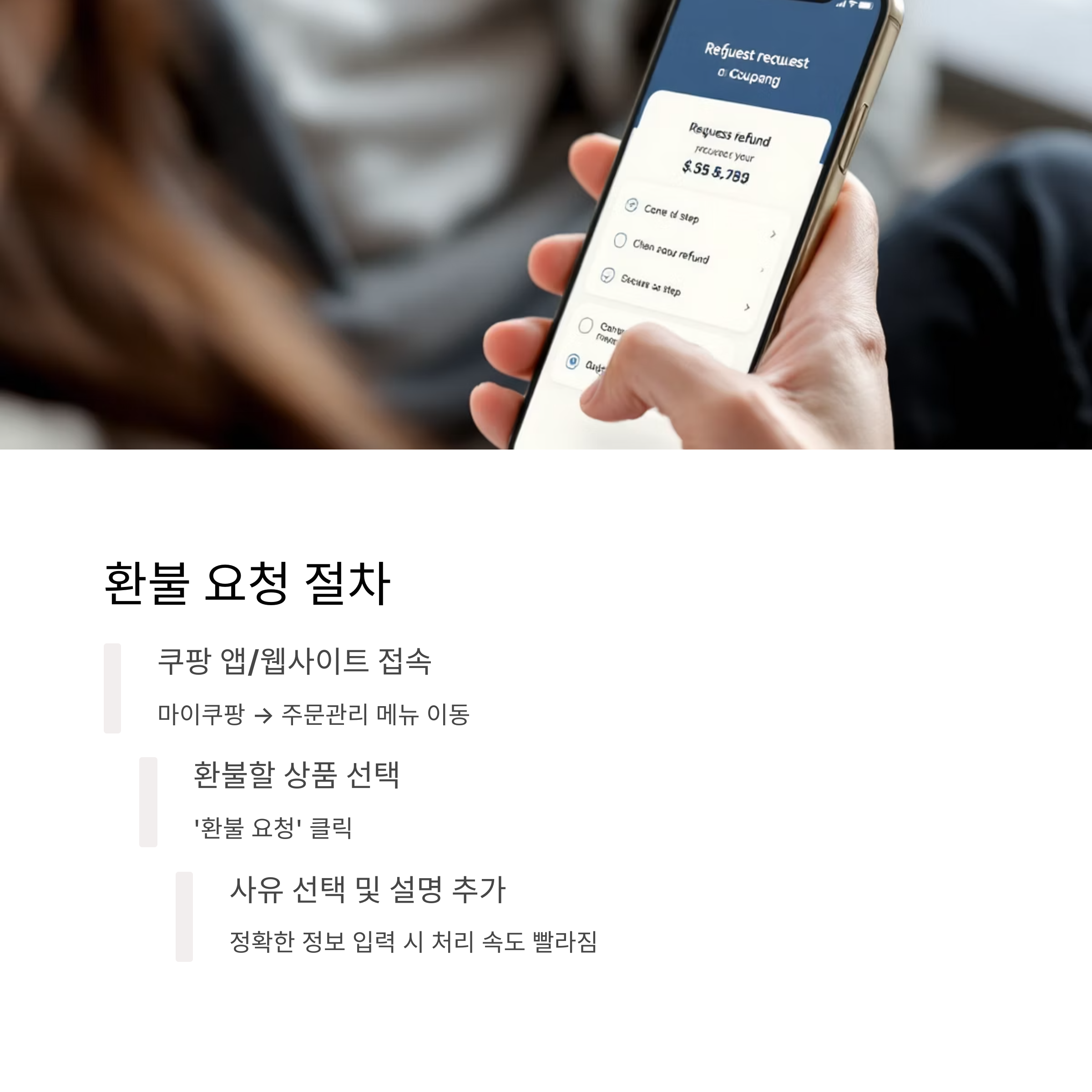 환불 요청 → 쿠팡 검토 → 환불 승인 및 입금이라는 과정이 필요하며, 요청량이 많거나 카드사 처리 지연 시 시간이 더 걸릴 수 있습니다.