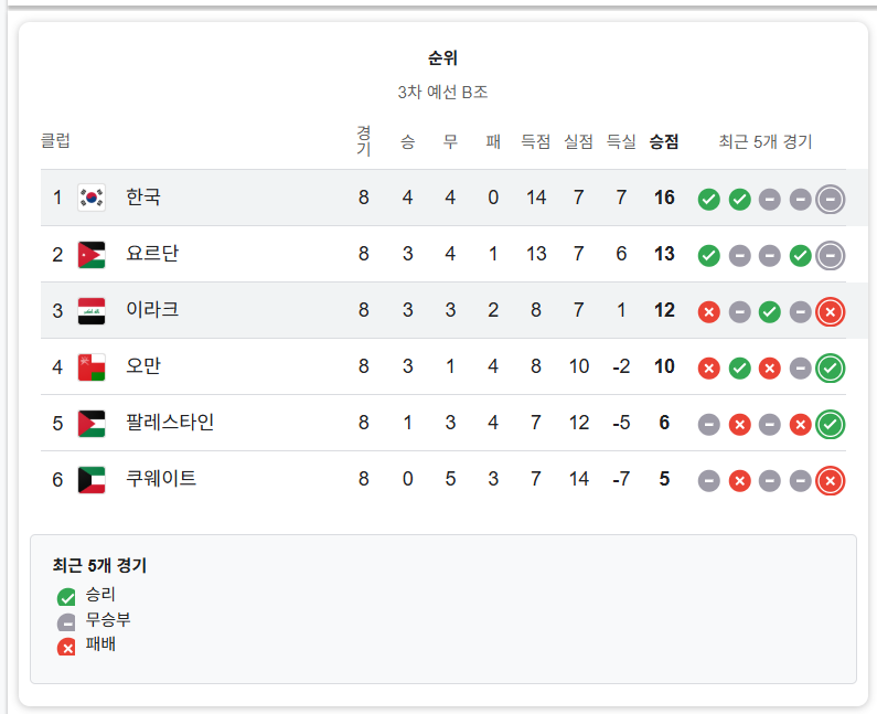 현재 B조의 순위 상황을 보면 한국이 1위를 유지 중이며, 이번 이라크전에서 무승부만 거둬도 월드컵 본선 진출을 확정짓습니다.