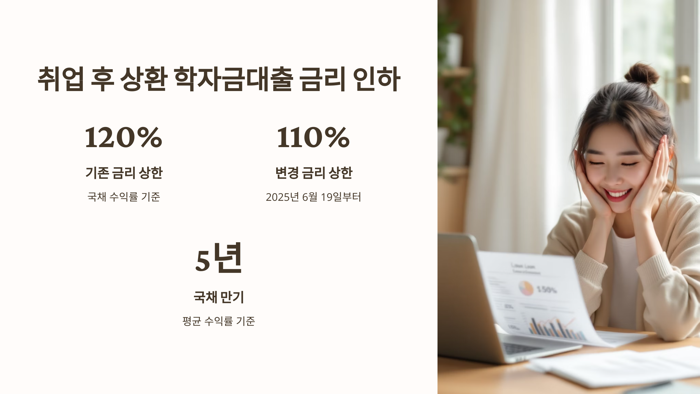 학자금대출을 이용하는 청년에게 희소식! 2025년 6월 19일부터 취업 후 상환 학자금 대출 금리 상한이 기존 120%에서 110%로 인하됩니다.