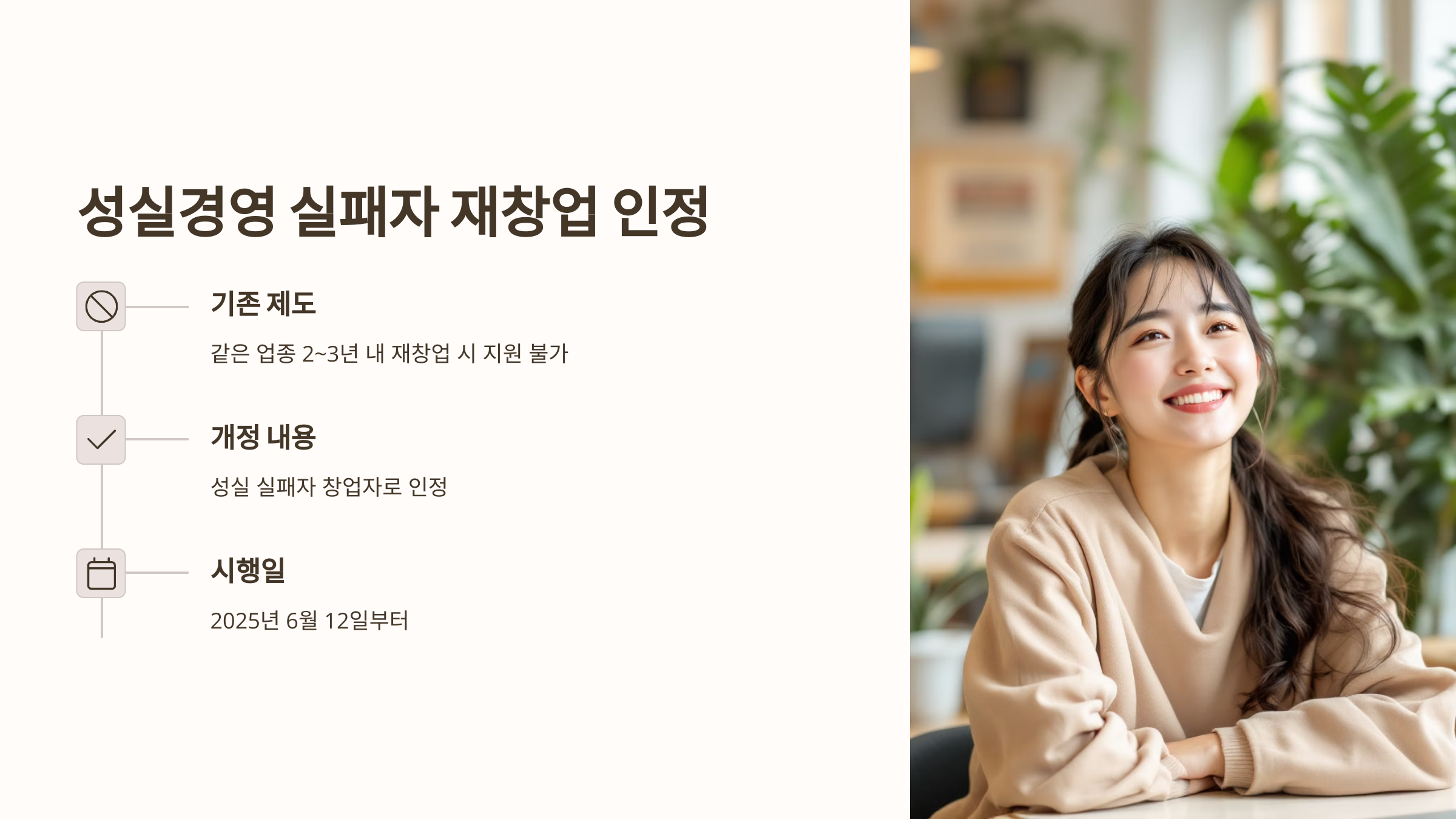 2025년 6월 12일부터 「중소기업창업 지원법 시행령」 개정으로 성실하게 경영했지만 실패한 사업자도 창업자로 인정받게 됩니다.